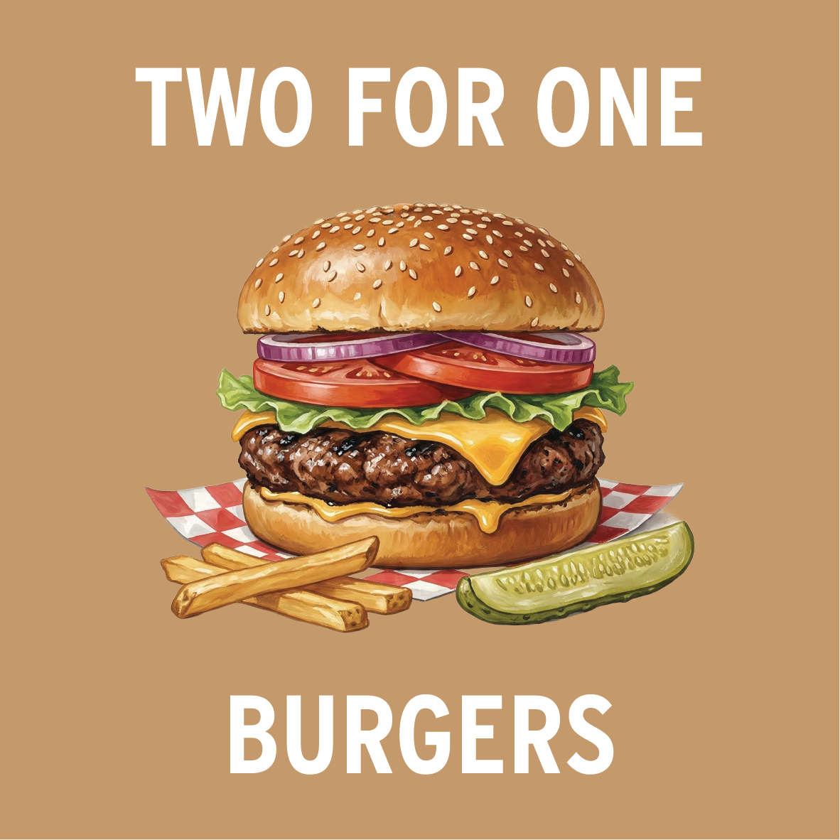 All of our delicious burgers are two for one, all day, every Monday and Tuesday.